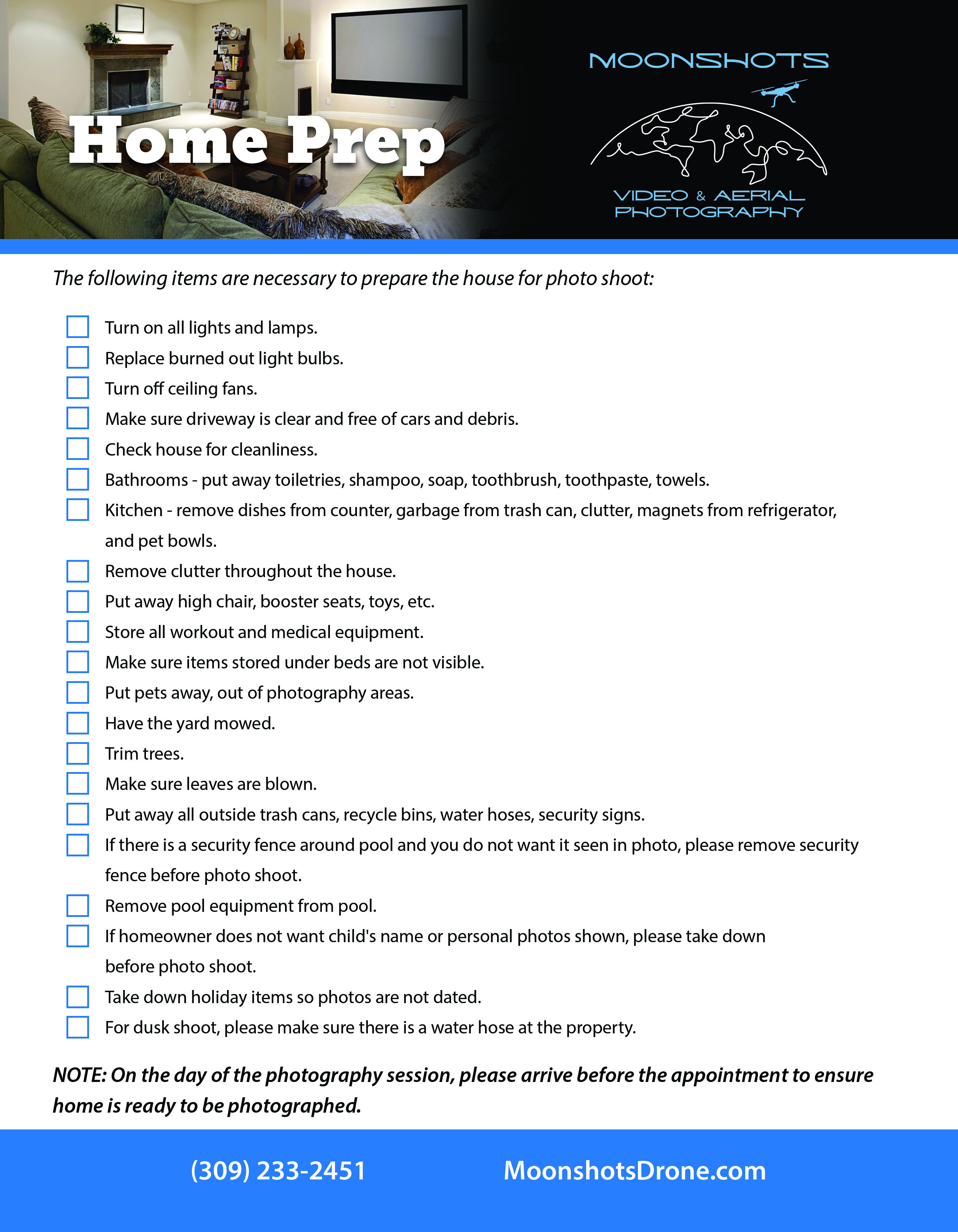 After setting an appointment with Moonshots Video and Aerial Photography, please review the home preparation flyer to ensure your property is ready for the photo shoot. Here you will see all those requirements for photography